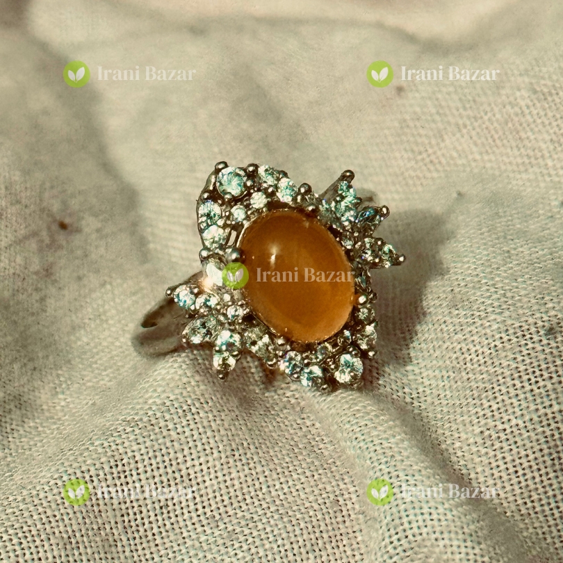 Experience the refined beauty of our Iranian Aqeeq Stone Silver Ring, featuring a warm yellow-toned agate gemstone set at the center of an intricately crafted silver design. The smooth, oval-cut stone is surrounded by delicately arranged accent stones, creating a radiant, crown-like frame that enhances its natural glow and elegance.