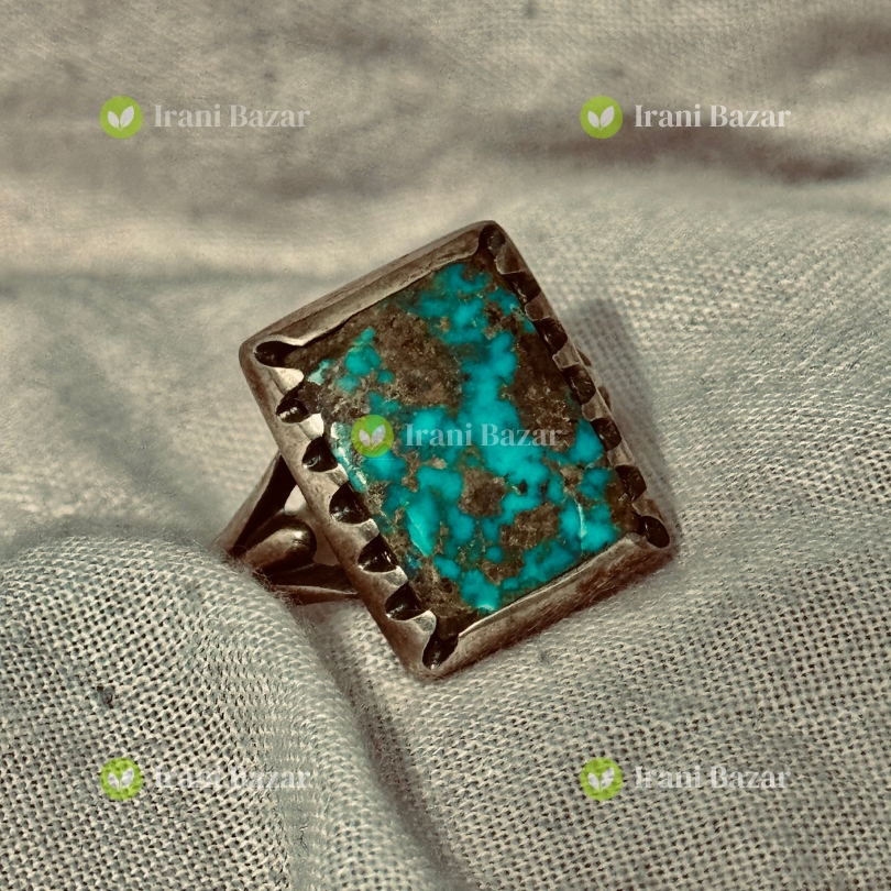 Discover the bold character of our Iranian Firoza Stone Silver Ring, featuring a striking square-cut turquoise gemstone framed in a handcrafted silver setting. The stone displays rich blue-green tones with natural mineral veining, giving each piece a distinctive, earthy elegance. Designed for those who appreciate strong lines and timeless craftsmanship, this ring blends traditional artistry with a modern, confident presence.